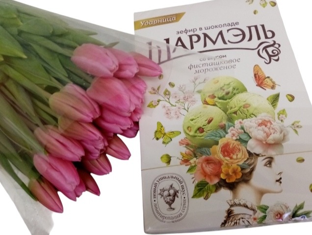 Букет из свежайших тюльпан и новый уникальный вкус зефира «Шармэль» фисташковое мороженое порадует любую обладательницу непременно.