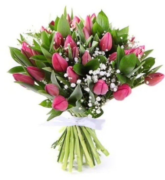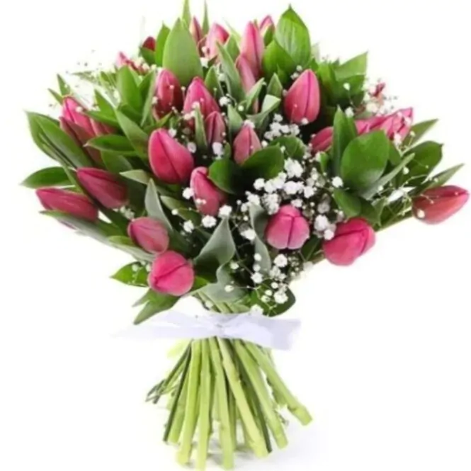 Состав букета : тюльпаны — 35шт, гипсофила белая, лента.