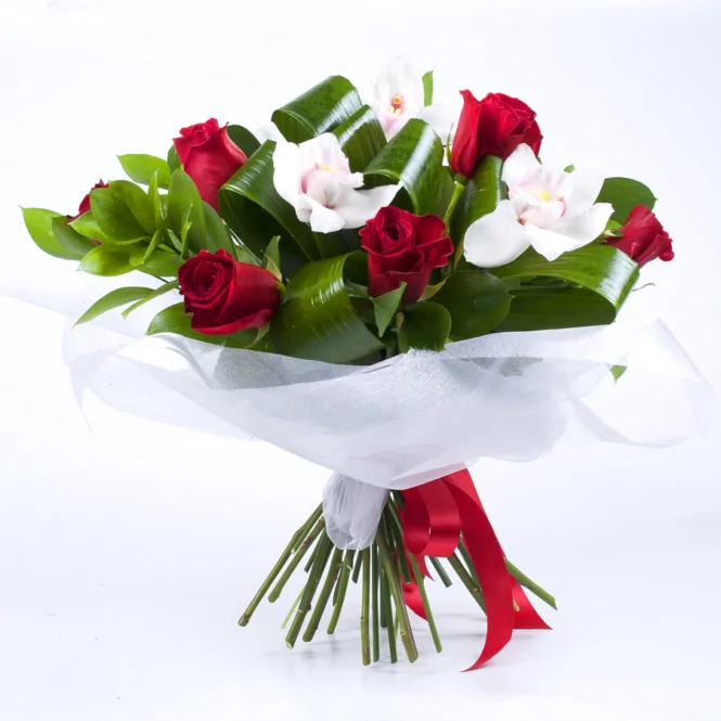 Орхидея в сочетании красной розы и листьями аспидистры очень эффектный букет. Контраст красной розы с белой орхидеей завораживает. Белая упаковка и алая лента добавляет чувственность. Японские листья аспидистры придадут шарм такому букету.