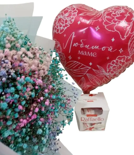 Подарочный набор с «Радужным»букетом из гипсофил, конфетами Раффаэлло и шар сердце обрадует абсолютно любую маму!