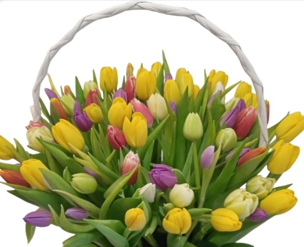 Состав корзины : тюльпаны — 75 шт, плетёная корзина, оазис(флористическая губка).